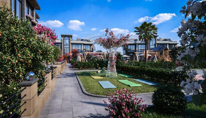 Зона отдыха на свежем воздухе и сад на территории комплекса.